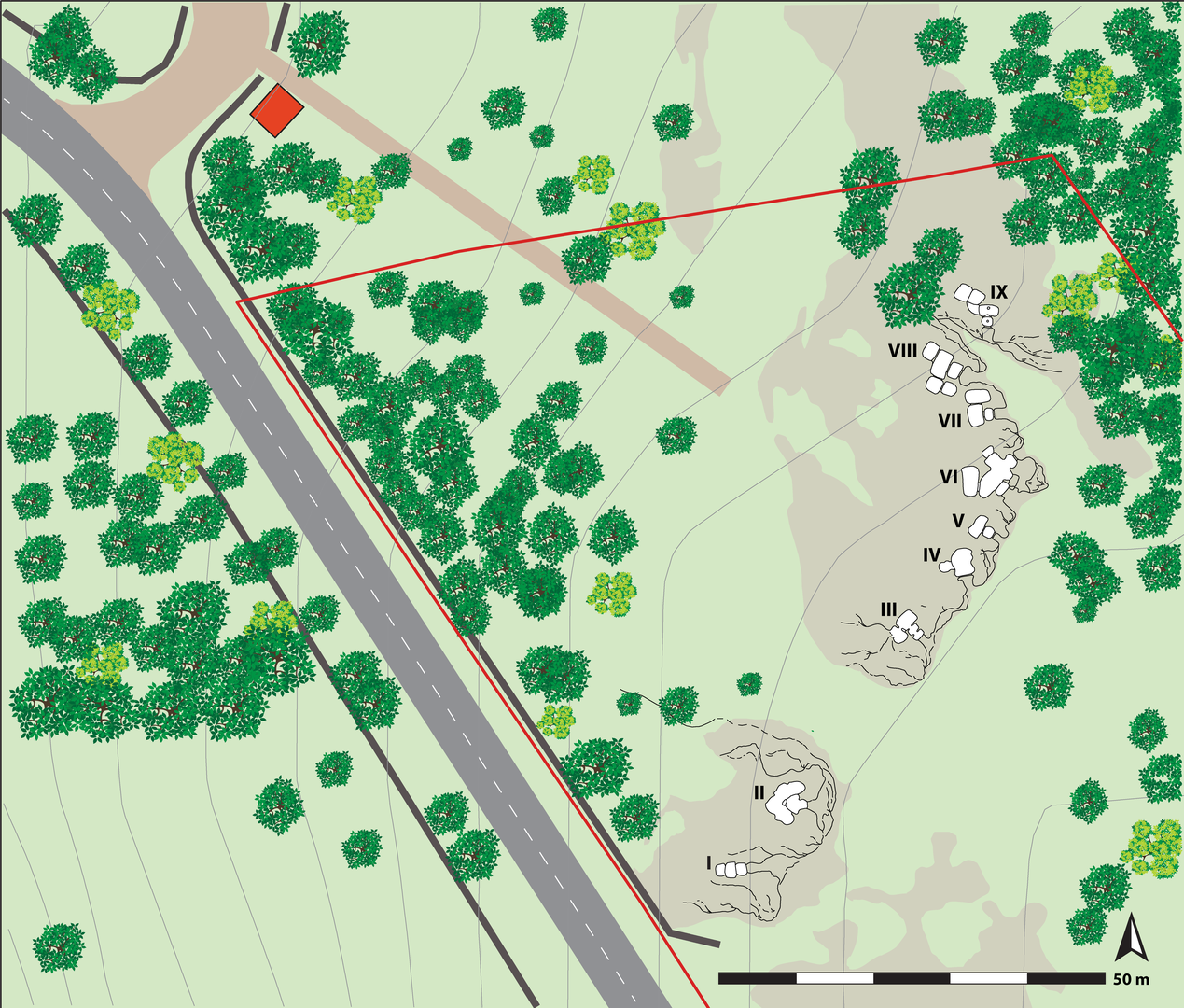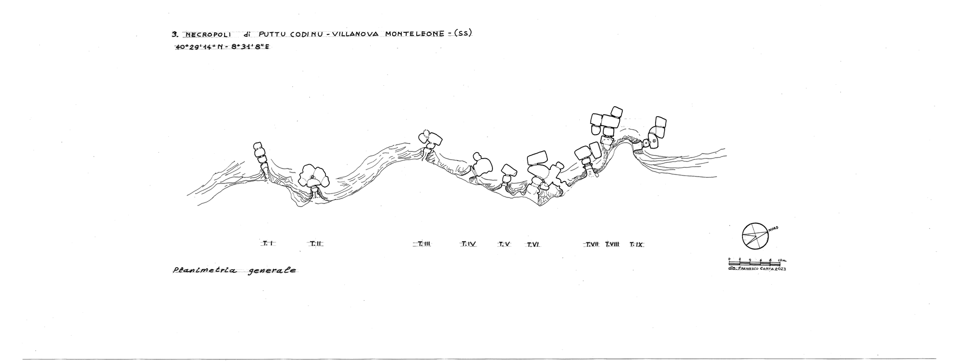Nello sviluppo planimetrico delle tombe predomina lo schema a “T”, costituito da breve dromos, padiglione, anticella, cella principale disposta in senso trasversale e una o più celle ai lati di quest’ultima. La Tomba I, diversamente dalle altre, ha schema longitudinale, Tipo 2 Tanda (2021), con tre vani, oggi privi del soffitto, disposti lungo l’asse longitudinale.