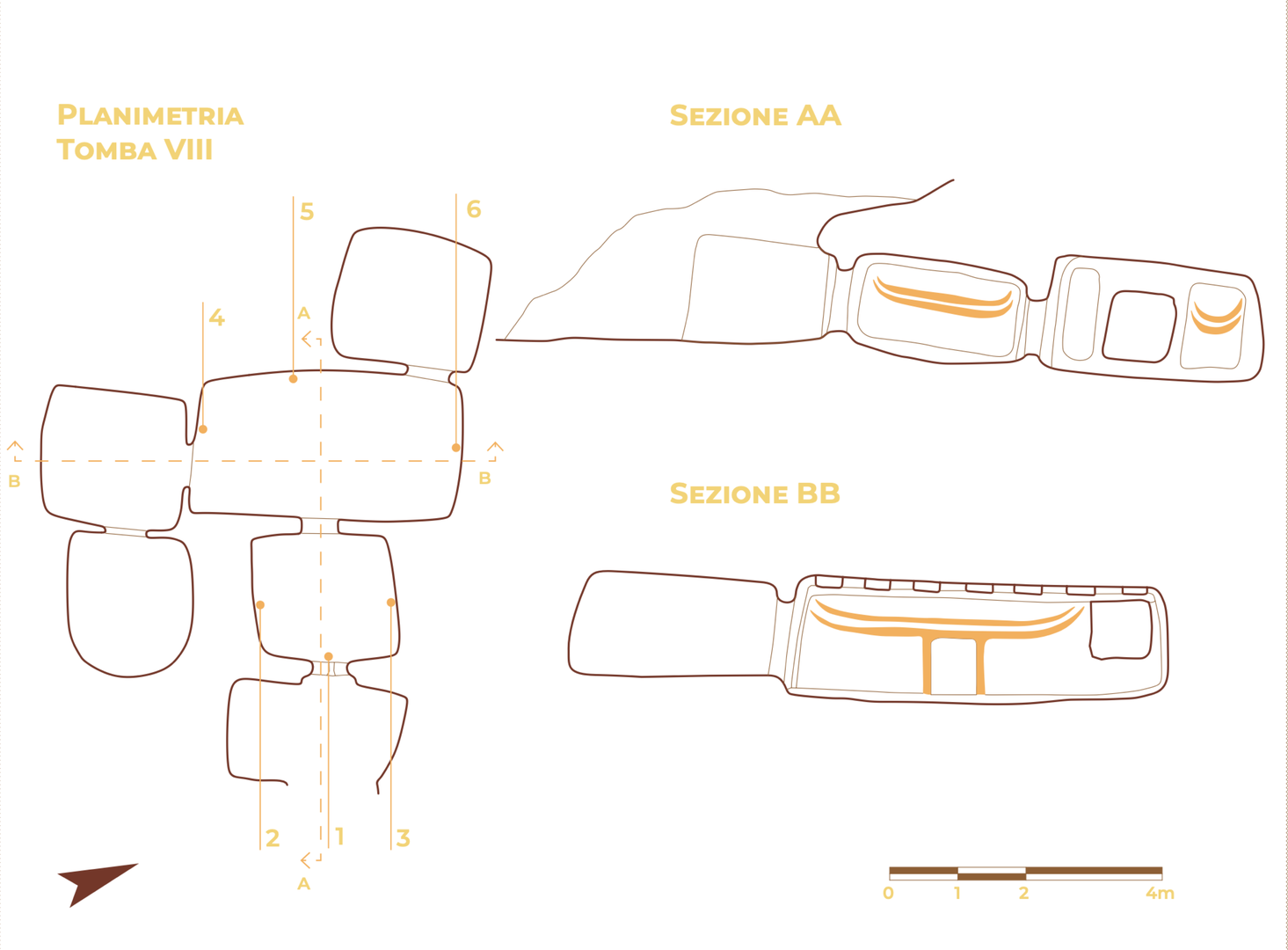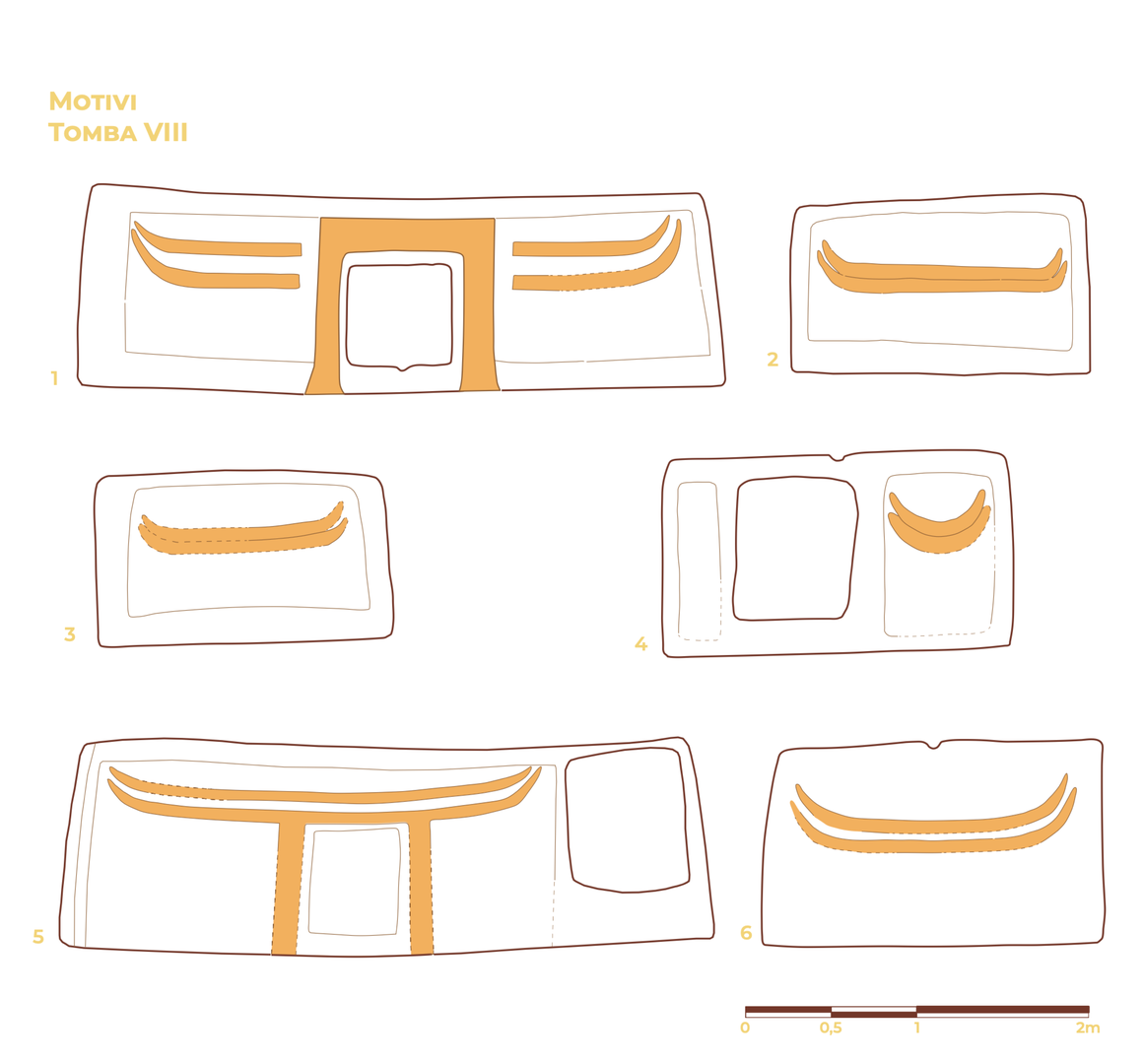 La Tomba VIII presenta i motivi più raffinati dell’intero complesso ed è situata nella parte settentrionale della necropoli. L’ipogeo è costituito da sei ambienti, preceduti da un breve dromos (1,20 m), orientato ad est, lievemente sopraelevato dal suolo, che conduce a un padiglione di pianta quadrangolare privo di soffitto. Sulla parete di fondo del padiglione si apre un portello rettangolare provvisto di incasso per l’alloggiamento del chiusino litico. La soglia, sopraelevata dal pavimento del padiglione, è solcata da una canaletta.