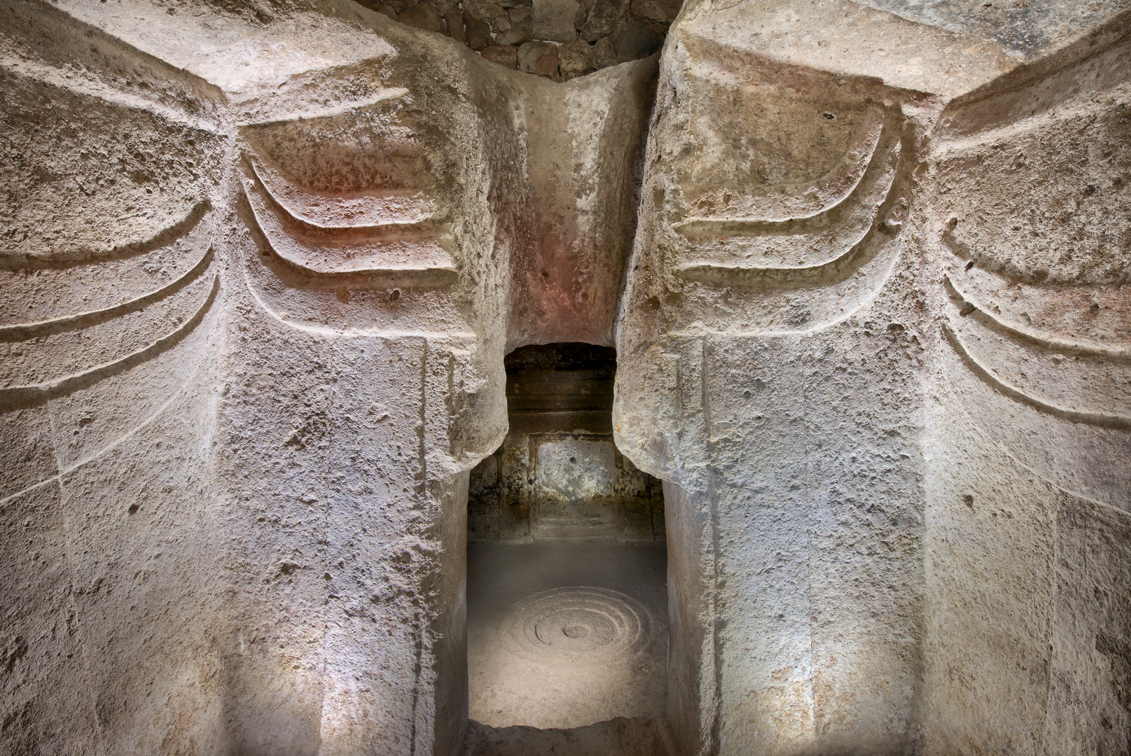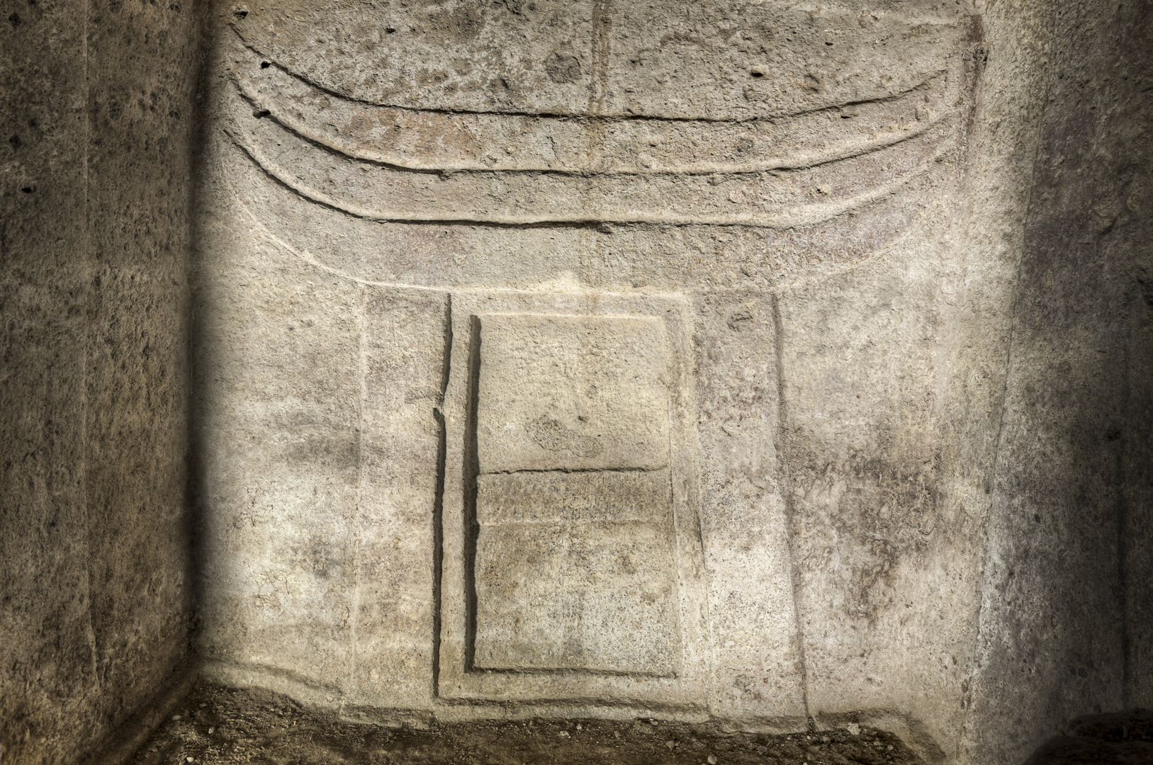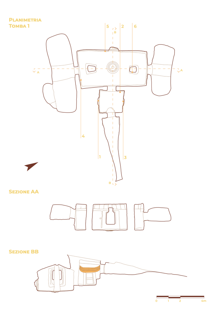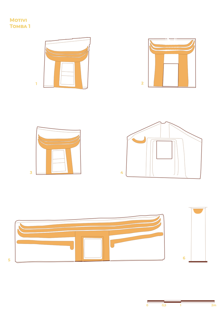 Nella tomba si osservano le tappe finali del processo evolutivo del motivo a protomi taurine, che vede il progressivo allontanamento da una rappresentazione naturalistica dell’animale verso una graduale schematizzazione e astrazione della forma. Contemporaneamente a tale evoluzione, si osserva un crescente valore dei portelli d’ingresso. Nell’anticella, la fusione delle corna con il portello d’ingresso per la cella principale rappresenta una tappa significativa: la simbolizzazione del portello che, attraverso un processo di sostituzione, si identifica con la testa della protome bovina. Da questo momento, secondo Tanda (2021), il portello sormontato da corna assume una valenza sacra e l’introduzione del defunto attraverso “l’animale divino” acquista un valore magico-rituale, iniziatico e propiziatorio. Il processo simbolico si conclude con il motivo scolpito nella parete di fondo della cella principale. Qui il portello, trasformato in falsa porta, non è più accessibile. La figura delle corna fuse con la falsa porta assume dunque un valore simbolico, dove l’accesso non è più consentito al corpo del defunto, ma solo allo spirito.