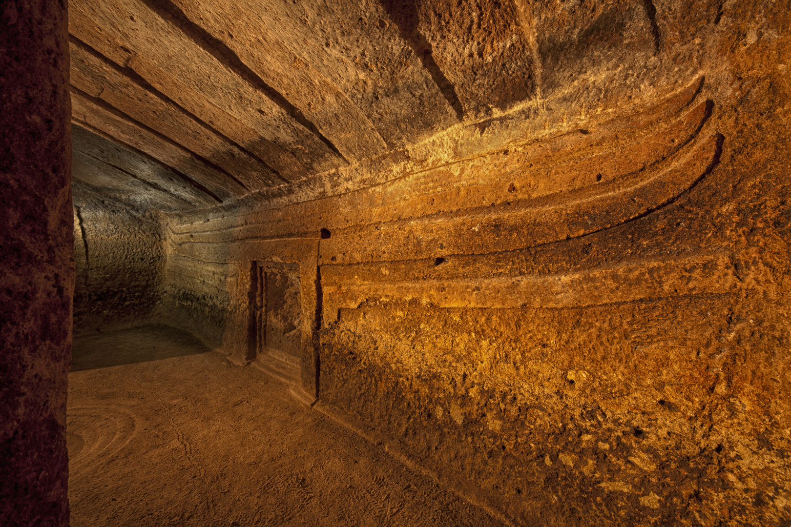 Tra le imitazioni di elementi architettonici tipici dell’abitazione dei vivi si segnalano il soffitto a doppio spiovente, i pilastri e il focolare. Il soffitto caratterizzato da doppia falda, con rappresentazione della trave centrale e i travetti laterali Tipo I Tanda (2015), è presente in ventitré ipogei.