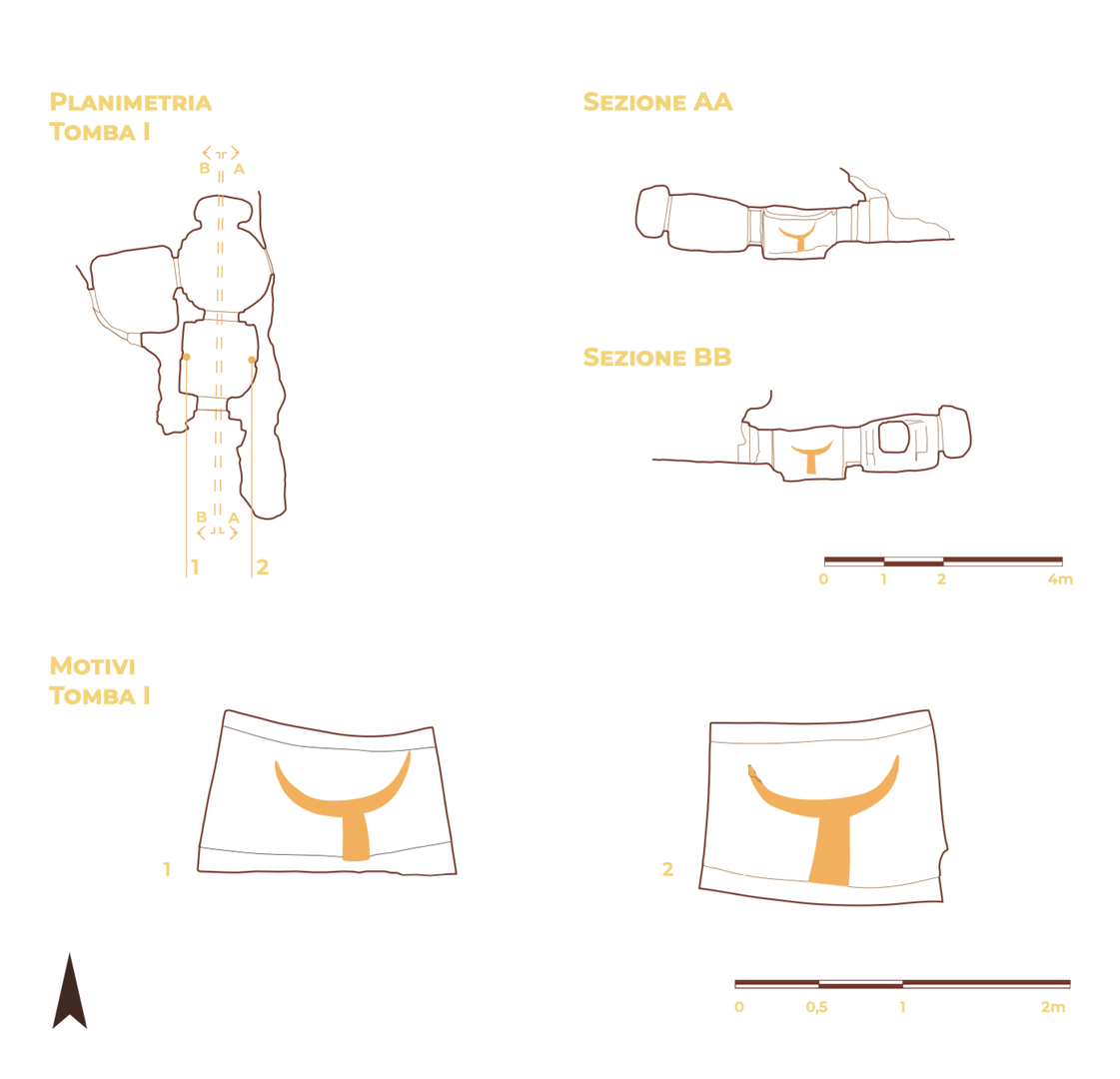 L’ingresso è preceduto da un dromos (a) di circa un metro di lunghezza, terminante in una brevissima espansione che precede la doppia cornice del portello di accesso. Dopo il portello, quadrangolare, si incontra l’anticella (b): un ambiente quadrangolare (1,37 x 1,40 m, alt. 0,83 m) riccamente ornato da rilievi scolpiti alle pareti. Sulle pareti dell’anticella sono presenti due motivi corniformi: entrambi ascrivibili al Tipo IV Tanda (2021), sono costituiti da corna lunate di stile naturalistico che sovrastano la riproduzione schematica della testa, resa con un semplice rilievo trapezoidale. Alla base delle pareti corre un basso zoccolo mentre una sottile fascia è presente nella parte superiore poco sotto il soffitto. Il portello di accesso fra l’anticella e la stanza successiva (c), quadrangolare, presenta ai lati la riproduzione, sempre in rilievo, di due stipiti forniti di plinto e abaco. Il vano è una cella di forma sub-circolare (1,30 x 1,48 m, alt. 0,90 m) su cui si aprono una nicchia sopraelevata, nella parete settentrionale, e un’altra cella più grande, nel lato ovest. La celletta o nicchia sopraelevata (d), con portello sicuramente ingrandito, ha pianta lievemente ellittica e pareti e soffitto incurvati. Il portello che comunica con la cella e, nel lato ovest, ripete il motivo delle lesene con plinto e abaco in rilievo, oggi appena leggibile. Tramite questo si accedeva a un ambiente quadrangolare (1,40 x 1,50 m, alt. 0,85 m), oggi aperto nel lato meridionale e in parte privo della copertura a causa del degrado della roccia.