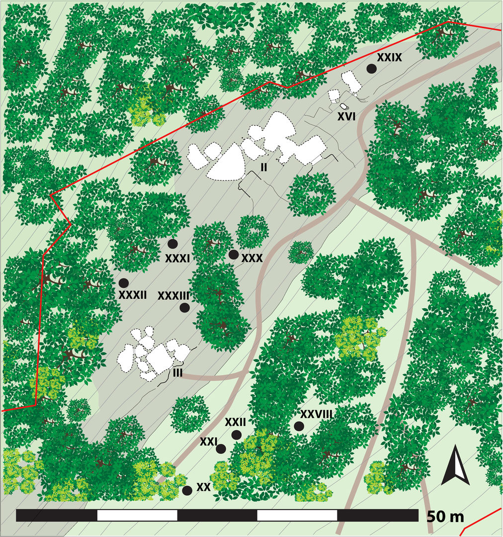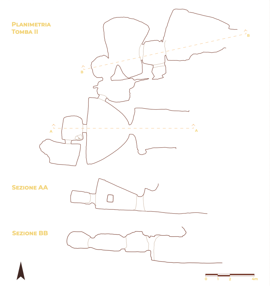 Lo scavo ha rivelato la lunga durata dell’utilizzo dell’ipogeo ricostruita attraverso il recupero di materiali riferibili agli aspetti culturali di Ozieri, Filigosa, Monte Claro, Campaniforme, Bonnanaro e alle fasi del Bronzo medio iniziale, Bronzo finale/prima età del Ferro e Altomedievale. Due le datazioni radiometriche, una dal dromos ottenuta da carboni all’interno dell’US 36 (3088-2586 BC) e riferibile a Filigosa, l’altra ricavata dai resti combusti all’interno di una cista litica associati a una ciotola del Bronzo finale-Primo Ferro (1111-841 BC). La Tomba II presenta uno schema planimetrico articolato in tredici ambienti disposti secondo due assi principali. Prima dell’intervento di scavo erano visibili soltanto nove celle, alle quali si accedeva tramite un ristretto varco nel terreno antistante l’ambiente m. Alla sinistra di questo sono stati individuati, invece, il dromos a, largo 3,10 m e profondo circa 4 m e il padiglione b (largh.: 3,20 m, prof.:1,12 m) con nicchia laterale marginata da una cornice, attraverso i quali è possibile entrare direttamente nell’ipogeo principale. Il portello d’ingresso è rettangolare, orientato a SE; esso immette in un’ampia anticella c (5,40 x 3,40 m) di pianta semicircolare, il cui soffitto - spiovente verso l’ingresso e con un’altezza massima di 2,45 m - mostra la rappresentazione di una trave realizzata in negativo in posizione lievemente decentrata rispetto all’ingresso. Nella Tomba 2 si registra una raffigurazione apparentemente anomala. Infatti, l’anticella semi-ellissoidale è coperta verso l’ingresso da un soffitto a unico spiovente (Tipo III) fuso con il soffitto di Tipo I e quello di Tipo IV. Inoltre, in corrispondenza della parete di fondo, il soffitto assume una doppia inclinazione (Tipo I) e, nel punto di massima altezza, coincidente con il culmine della copertura, presenta una lunetta semicircolare realizzata a basso rilievo (Tipo IV, Varietà con segni magico-religiosi). Da questa, a partire dal punto della massima convessità, parte una rappresentazione a rilievo negativo di una trave che si sviluppa lungo lo spiovente fin quasi all’ingresso, ma in posizione appena decentrata. Peraltro si rileva l’associazione, in uno stesso ipogeo, del Tipo 4 e del Tipo 1, della Varietà con segni magico-rituali Tanda (2021). La parete di fondo, rettilinea, presenta tracce di intonaco dipinto nei colori rosso ocra, bianco e grigio antracite; su di essa si apre un portello trapezoidale, riquadrato da una cornice, che immette nella cella d, quadrata, di piccole dimensioni in asse con l’ingresso. Adiacente a essa, sulla sinistra, vi è un ambiente laterale, in origine di forma rettangolare poi modificata nel tentativo di ampliare lo spazio. Dall’anticella c, attraverso un piccolo portello quadrangolare realizzato presso la parete settentrionale curvilinea, si giunge a un ambiente irregolare f che funge da raccordo e da collegamento tra il gruppo di vani c-e e gli ambienti g-m. Queste serie di celle, disposte su un unico asse longitudinale O-NO/E-SE e collegate tra loro da portelli slargati, mostrano schemi planimetrici irregolarmente quadrangolari con pareti rettilinee, raramente curvilinee, spesso fessurate dalle radici e dalle infiltrazioni di acqua che penetrano all’interno dell’ipogeo danneggiandone la struttura. La cella h, presenta sul pavimento setti divisori in rilievo; l’ambiente m presenta pianta rettangolare, un ampio accesso realizzato abbattendo la parete orientale e costituendo un unico ambiente con la cella n. Quest’ultima cella, di forma quadrangolare, oggi a cielo aperto, è preceduta da una piccola anticella o, di forma sub-circolare.