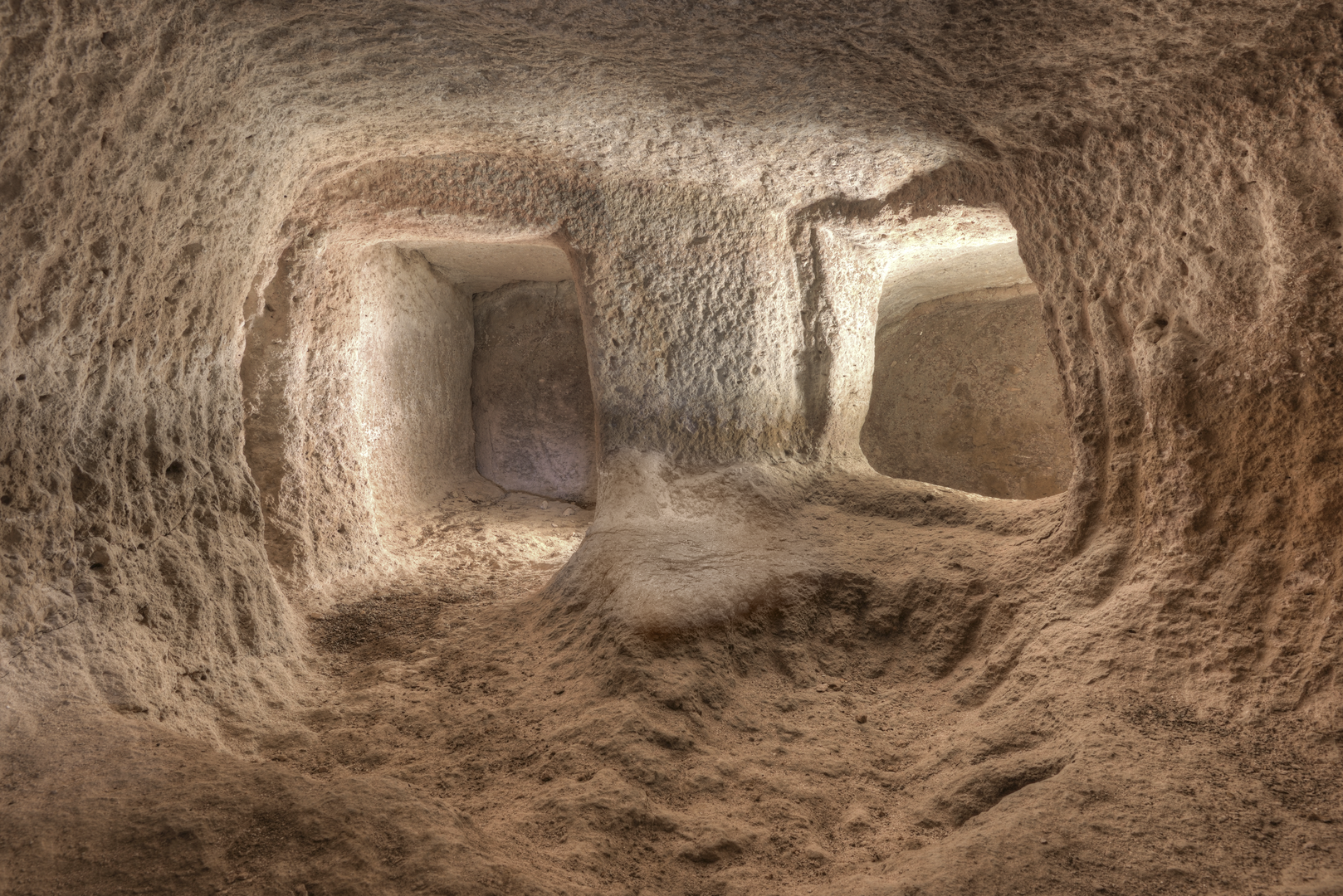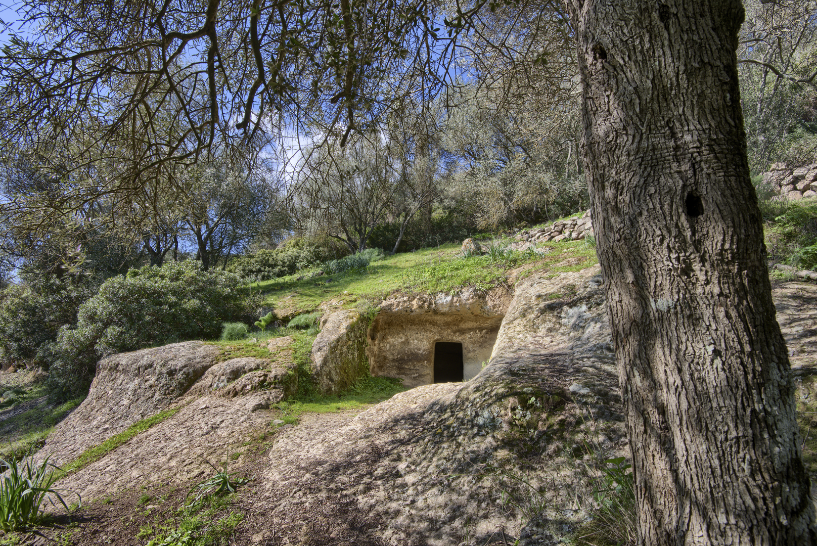 Tombe ipogeiche scavate nella roccia calcarea con decorazioni simboliche, testimoni della spiritualità delle comunità prenuragiche.