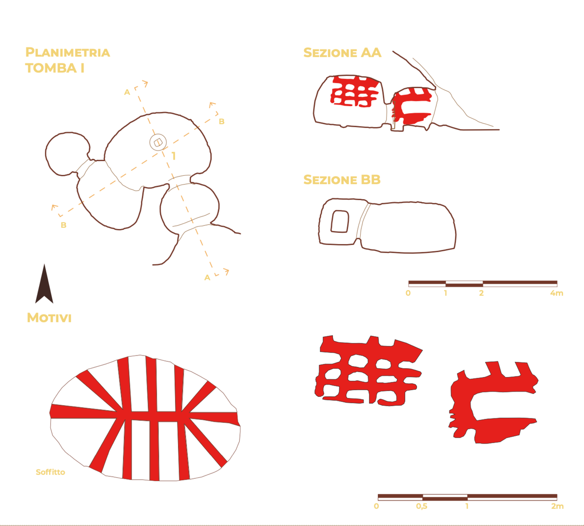 Sulla parete d’ingresso e in parte su quelle laterali della cella principale, è presente un motivo dipinto “a reticolato” costituito da fasce orizzontali e verticali di colore rosso. Il disegno, ben conservato sulla parete est per tre serie sovrapposte di riquadri, prosegue al di sopra e ai lati del portello d’ingresso, con riquadri di dimensioni maggiori. Il motivo “a reticolato” riprodurrebbe, pur con le riserve del caso, l’intelaiatura delle pareti laterali della capanna preistorica costituita da pali sistemati in senso sia verticale sia orizzontale. Allo stato attuale delle ricerche, il motivo “a reticolato” - per le dimensioni eccezionali e per il fatto di essere reso tramite pittura - costituisce un unicum.