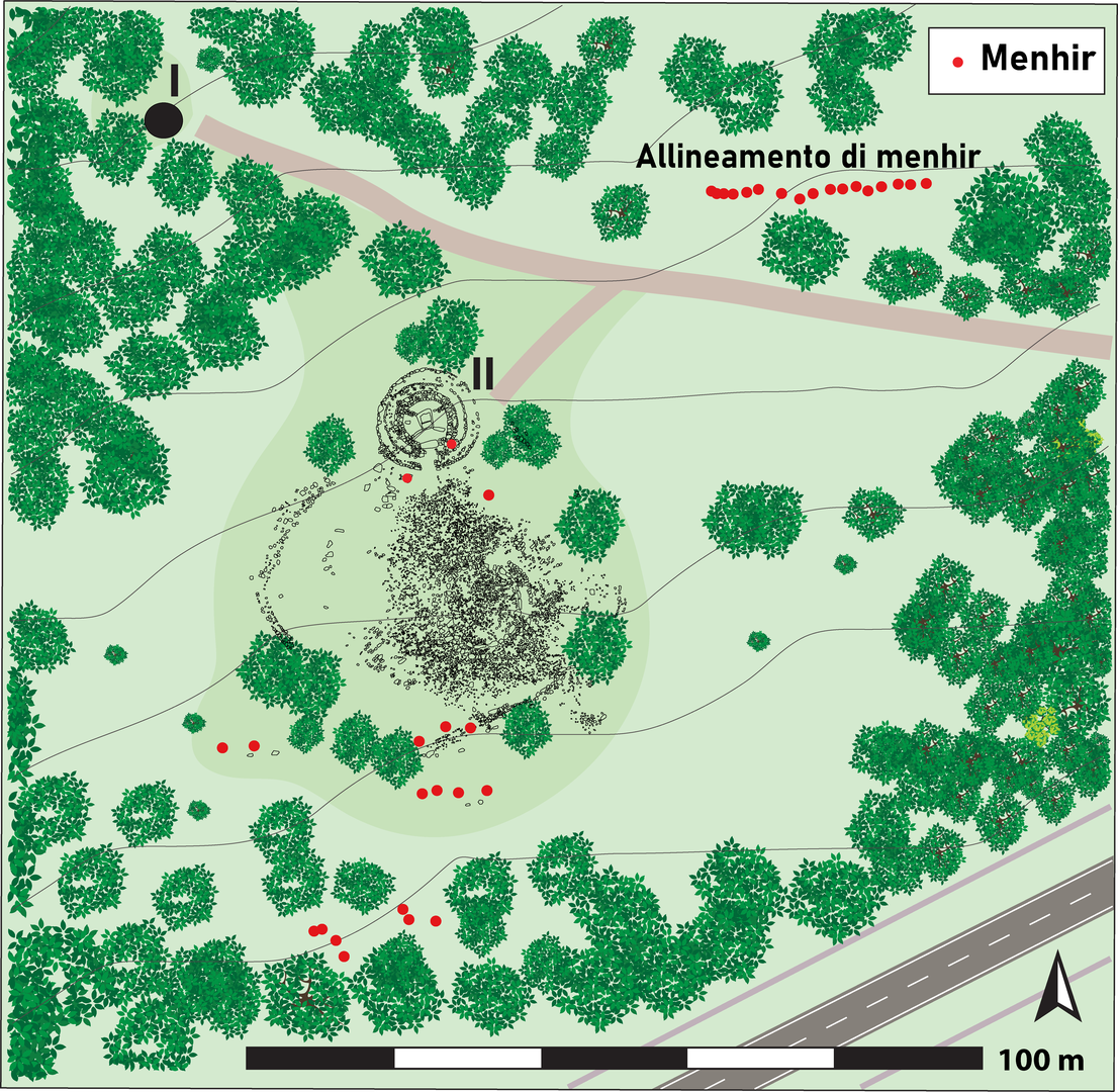 L’area è caratterizzata dalla presenza di circa sessanta menhir. Si tratta di un raggruppamento davvero notevole, che contrassegna un luogo sacro o di culto funerario. I menhir sono “aniconici”, non presentano cioè alcuna raffigurazione; sono del tipo “protoantropomorfo”, hanno forma ogivale, con la faccia anteriore piana e quella posteriore convessa, elementi che sembrano rifarsi alla figura umana. Sono realizzati in arenaria locale, sbozzati con una lavorazione fine e accurata, e alti sino a 2,50 m. Sono associati a strutture tombali (Tombe II e IV), oppure disposti variamente nell’area, isolati (più raramente), in coppie, in piccoli gruppi, in piccoli e grandi allineamenti, tra i quali il più numeroso è costituito da uno spettacolare gruppo di 20 esemplari.