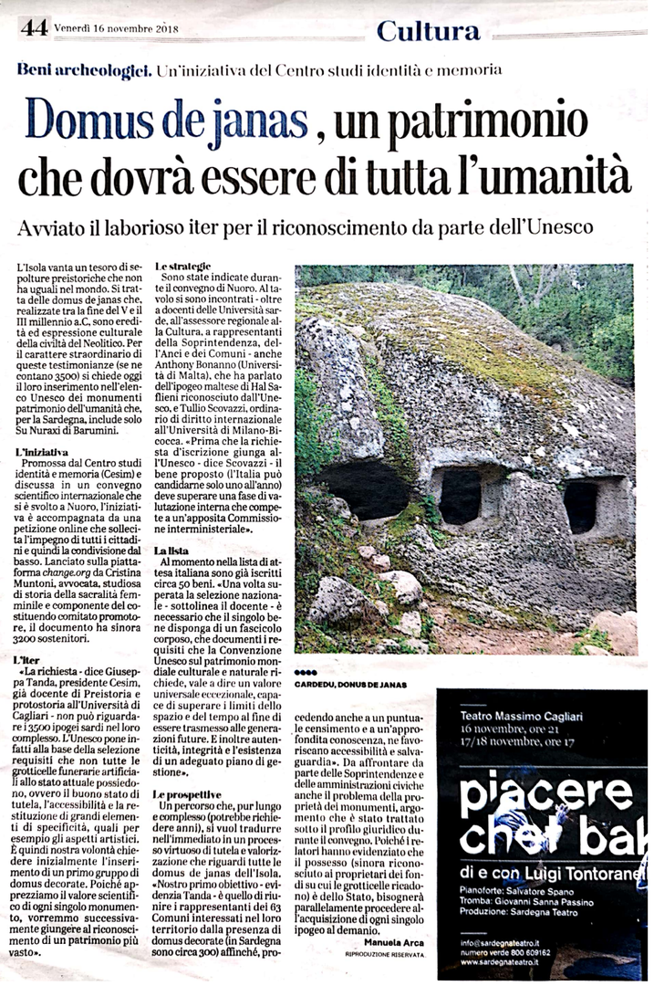 L’Unione Sarda dedica un ampio spazio al progetto del Centro Studi Identità e Memoria per ottenere il riconoscimento UNESCO delle Domus de Janas, le sepolture preistoriche scavate nella roccia, realizzate tra la fine del V e il III millennio a.C. Ad oggi si contano circa 3500 siti in tutta l’isola.