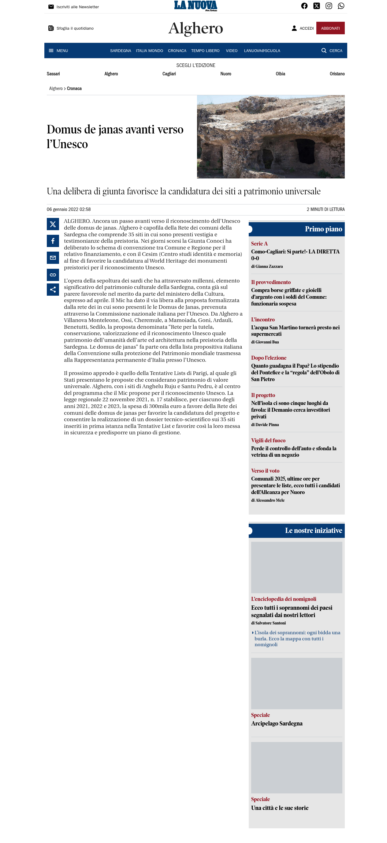 Un articolo de La Nuova Sardegna si concentra sull'avanzamento della candidatura delle Domus de Janas come patrimonio mondiale dell'UNESCO.
