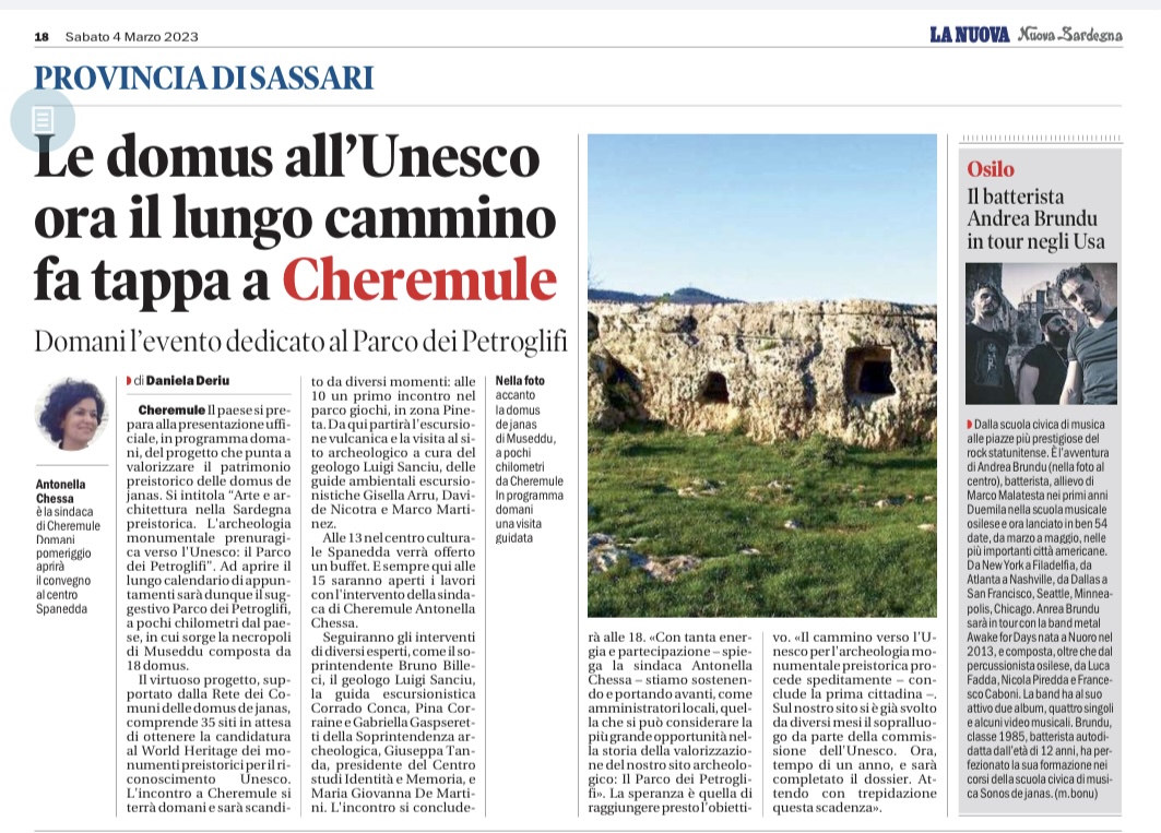 Il giornale La Nuova Sardegna ha pubblicato un articolo che annuncia un evento a Cheremule, dedicato al Parco dei Petroglifi, nell’ambito del progetto di valorizzazione e candidatura Unesco del patrimonio delle domus de janas.