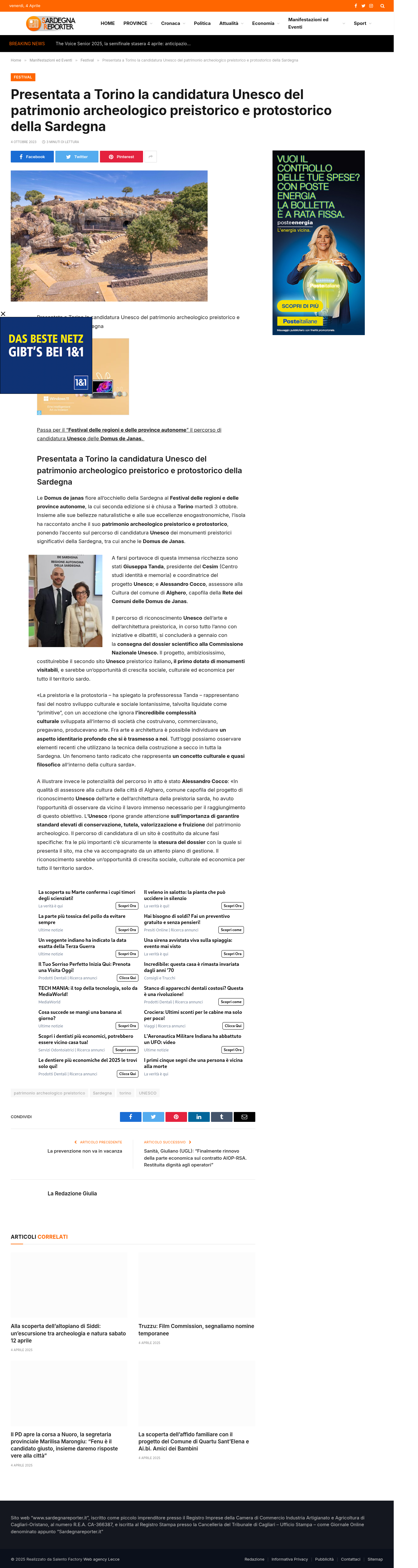Sardegna Reporter racconta la presentazione della candidatura Unesco per il patrimonio archeologico preistorico e protostorico della Sardegna, avvenuta durante il Festival delle regioni e delle province autonome, conclusosi a Torino il 3 ottobre.