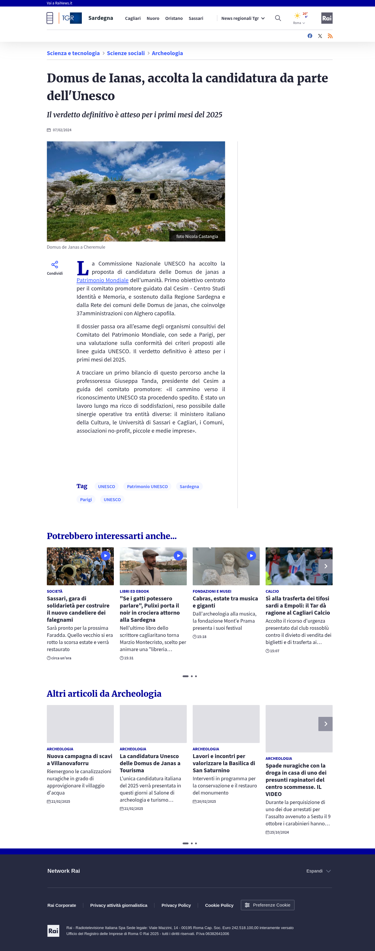 Rainews.it fa sapere che la Commissione Nazionale UNESCO ha accolto la proposta di candidatura delle Domus de janas a Patrimonio Mondiale dell'Umanità.