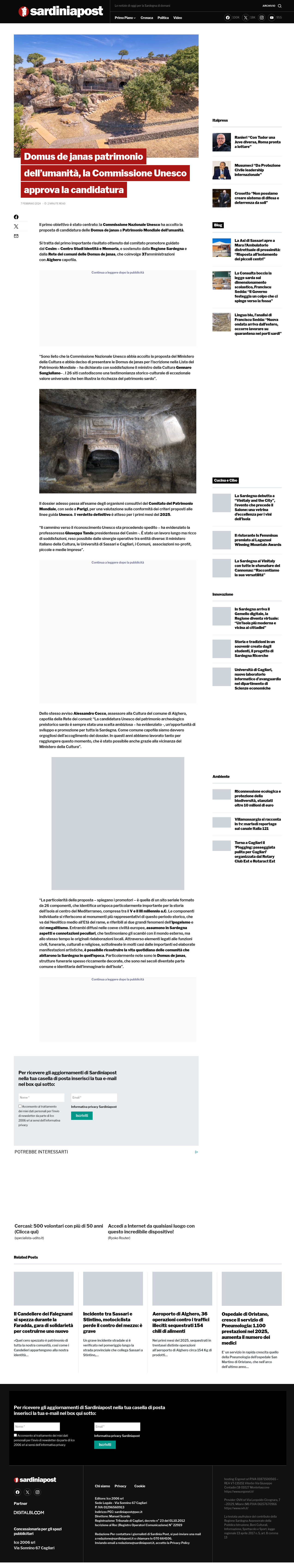 SardiniaPost dedica un articolo alla notizia che la Commissione Nazionale Unesco ha accolto la candidatura delle Domus de janas a Patrimonio Mondiale, primo passo verso il riconoscimento internazionale dell'archeologia preistorica sarda.
