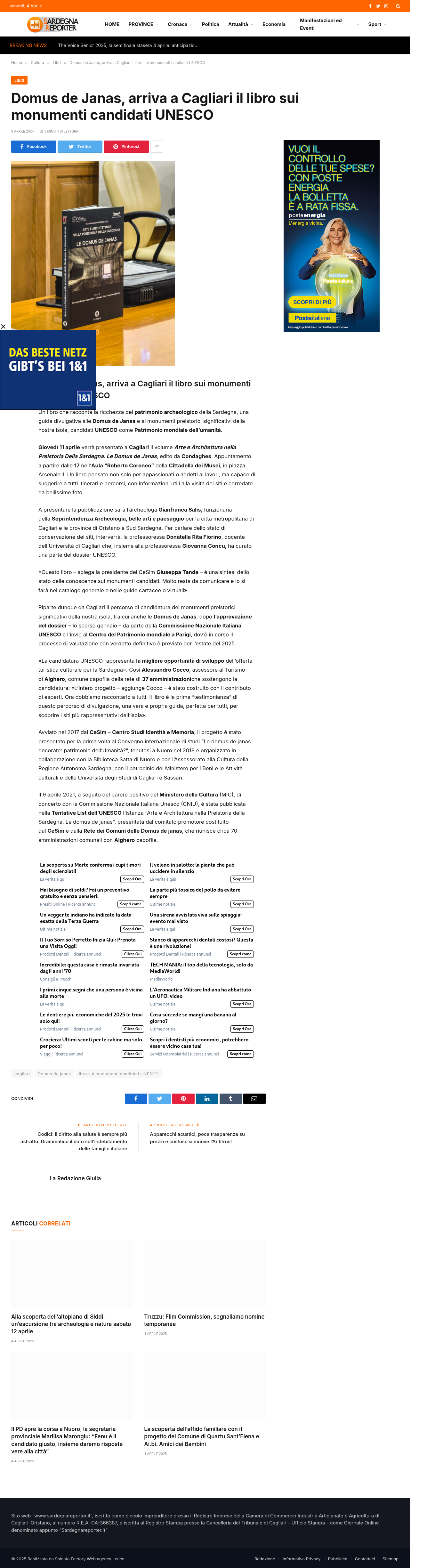 Sardegna Reporter ha raccontato l’arrivo a Cagliari del volume Arte e Architettura nella Preistoria della Sardegna. Le Domus de Janas, guida fotografica e divulgativa dedicata ai monumenti preistorici dell’isola candidati a diventare Patrimonio mondiale dell’umanità UNESCO. Il libro, presentato nella Cittadella dei Musei, rappresenta una tappa significativa nel percorso di valorizzazione avviato dal CeSim e sostenuto da una rete di comuni sardi.