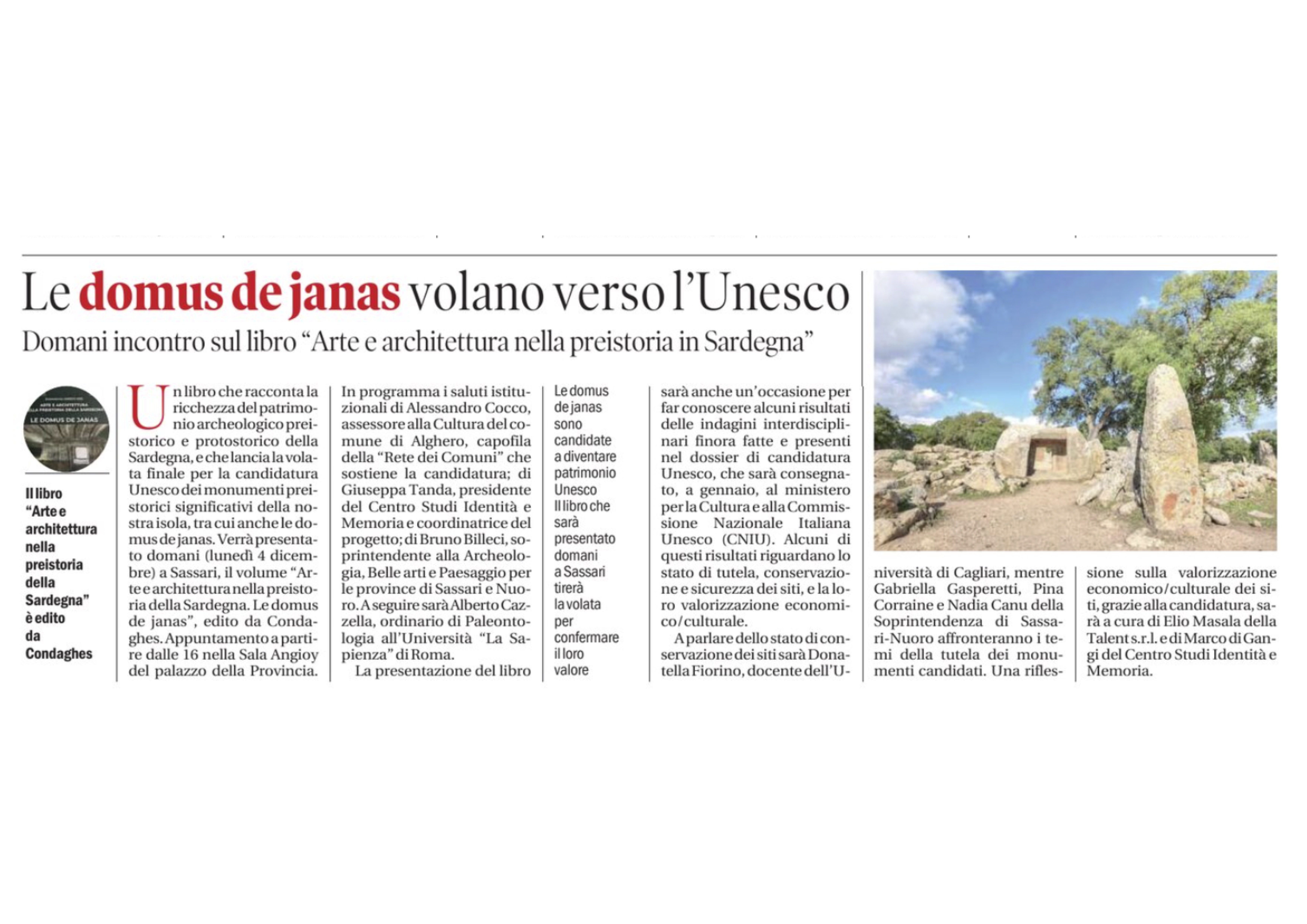 Il giornale La Nuova Sardegna ha pubblicato un articolo che esplora la candidatura delle domus de janas al patrimonio dell’umanità Unesco. Il libro “Arte e architettura nella preistoria della Sardegna” lanciato per la causa, racconta la storia e il valore di questi straordinari monumenti preistorici.