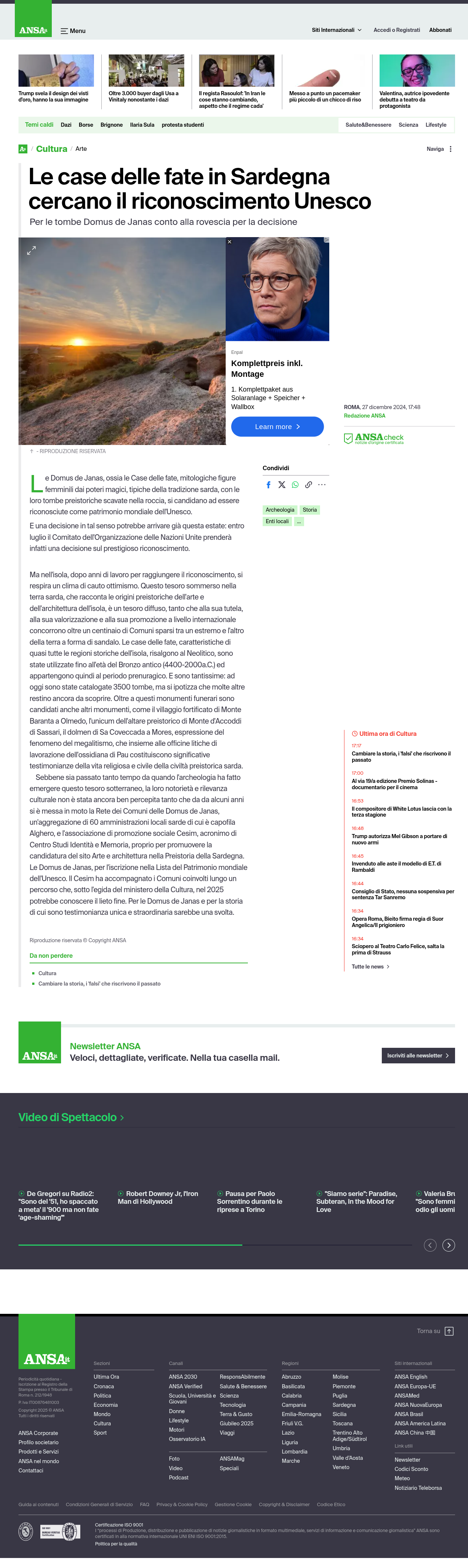Ansa dedica un articolo alle Domus de Janas, antiche tombe preistoriche sarde candidate al riconoscimento come patrimonio mondiale dell'Unesco.