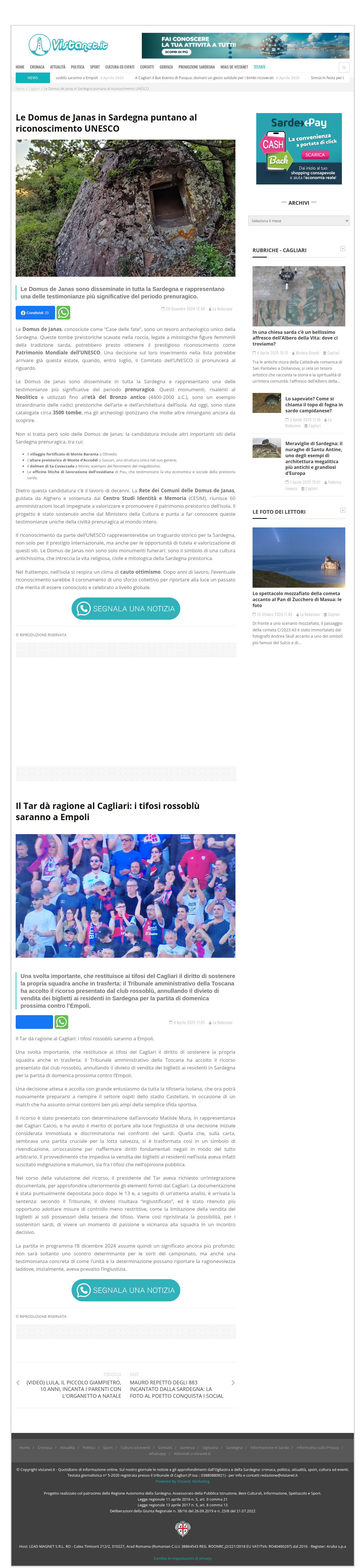 Vistanet parla delLe Domus de Janas, che sono al centro di una candidatura Unesco che coinvolge anche altri importanti siti della preistoria sarda.