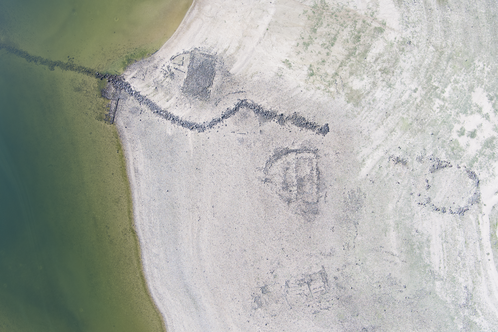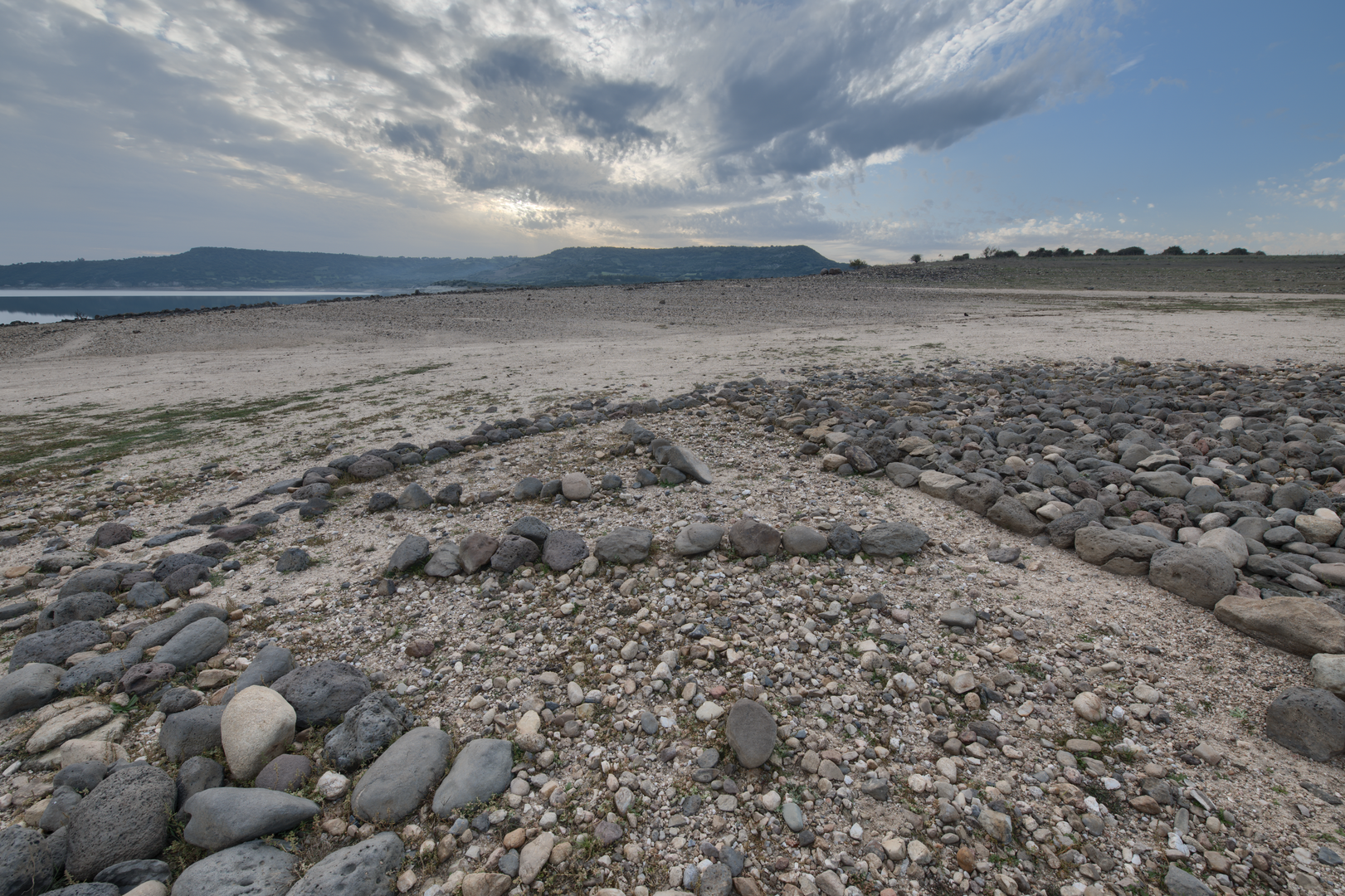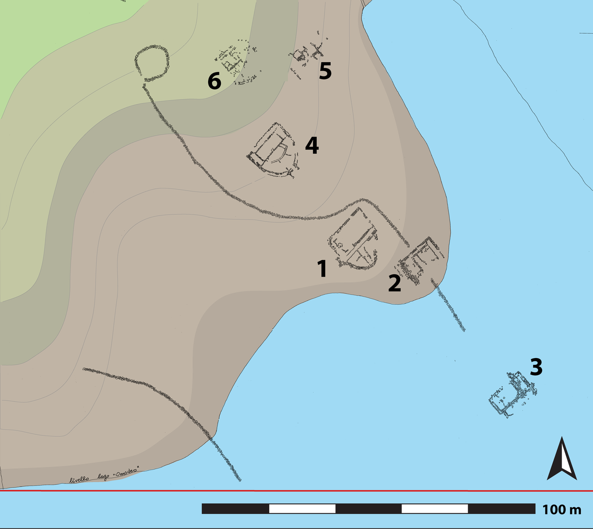 In corrispondenza del limite meridionale dell’insediamento, attualmente sommersa dal livello delle acque del bacino lacustre, si trova una struttura a sua volta anch’essa conservatasi per il solo filare di base, a tratti abbastanza ben conservato ma di difficile individuazione a causa dei ciottoli e dei detriti depositatisi al di sopra. L’edificio è di grandi dimensioni: misura, infatti, 19,50 m in corrispondenza del muro rettilineo occidentale, mentre la parte semicircolare ha un raggio esterno di 20,50 m. Il muro perimetrale è realizzato a doppio paramento con uno spessore murario che raggiunge 1,70 m nel tratto curvilineo settentrionale e 1,15-1,20 m in quello meridionale. L’accumulo di piccole pietre superficiali impedisce di seguire chiaramente lo sviluppo del muro rettilineo a ovest e di verificare l’eventuale presenza in questo lato di uno stretto corridoio interno; ugualmente difficoltosa è l’individuazione delle tracce relative a una suddivisione interna dell’ampia superficie semicircolare. L’ingresso alla struttura doveva aprirsi a est dove, in corrispondenza del punto di massima convessità del modulo semicircolare, si osserva un accumulo di pietre, tra cui si scorgono le tracce di segmenti murari forse ricollegabili alla presenza di un vestibolo o di un’altra struttura non ben interpretabile.