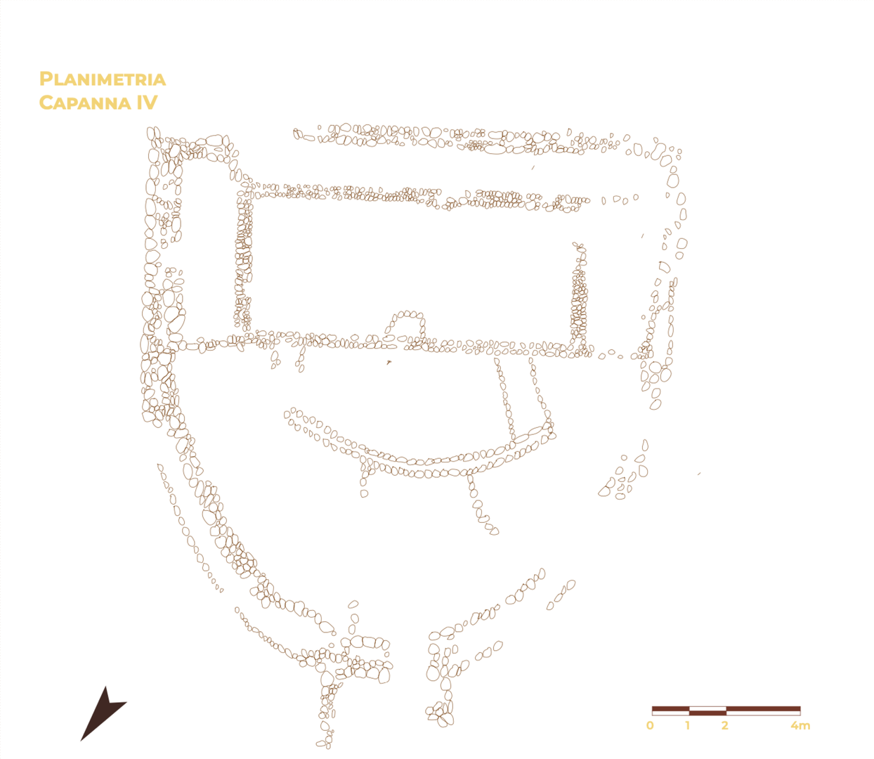 Le strutture meglio conservate sono realizzate in pietre di media dimensione sulla base di un modulo formato da due ambienti, uno rettangolare e uno semicircolare, adiacenti l’uno all’altro. Entrambi sono divisi, all’interno, da ulteriori partiture architettoniche rilevabili con difficoltà a causa dell’esiguo spessore di alzato residuo. Sono individuabili con chiarezza gli sviluppi planimetrici di nove abitazioni caratterizzate dallo schema sopra descritto e le piante di una capanna di forma circolare e di una grande struttura semicircolare; del restante insediamento residua solo qualche lacerto di muro non ricomponibile nel suo sviluppo complessivo.